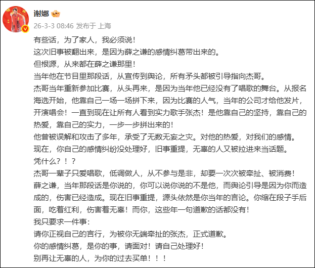 3月3日早晨,谢娜发微博公开喊话薛之谦,要求薛之谦给张杰道歉: