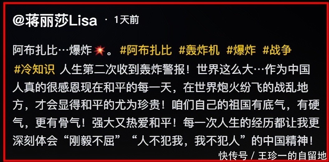 3月1日,蒋丽莎发文透露了他们的情况,她说在阿布扎比发生了爆炸,她还收到了轰炸警报。