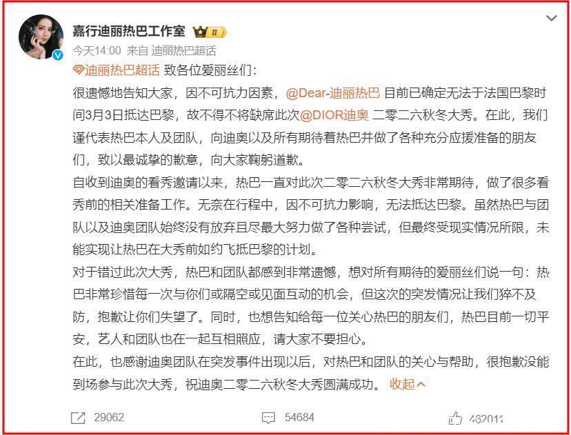 紧接着工作室直言迪丽热巴对这次的迪奥大秀很期待,也做了很多准备工作,但因为不可抗力影响,无法前去,实属无奈。