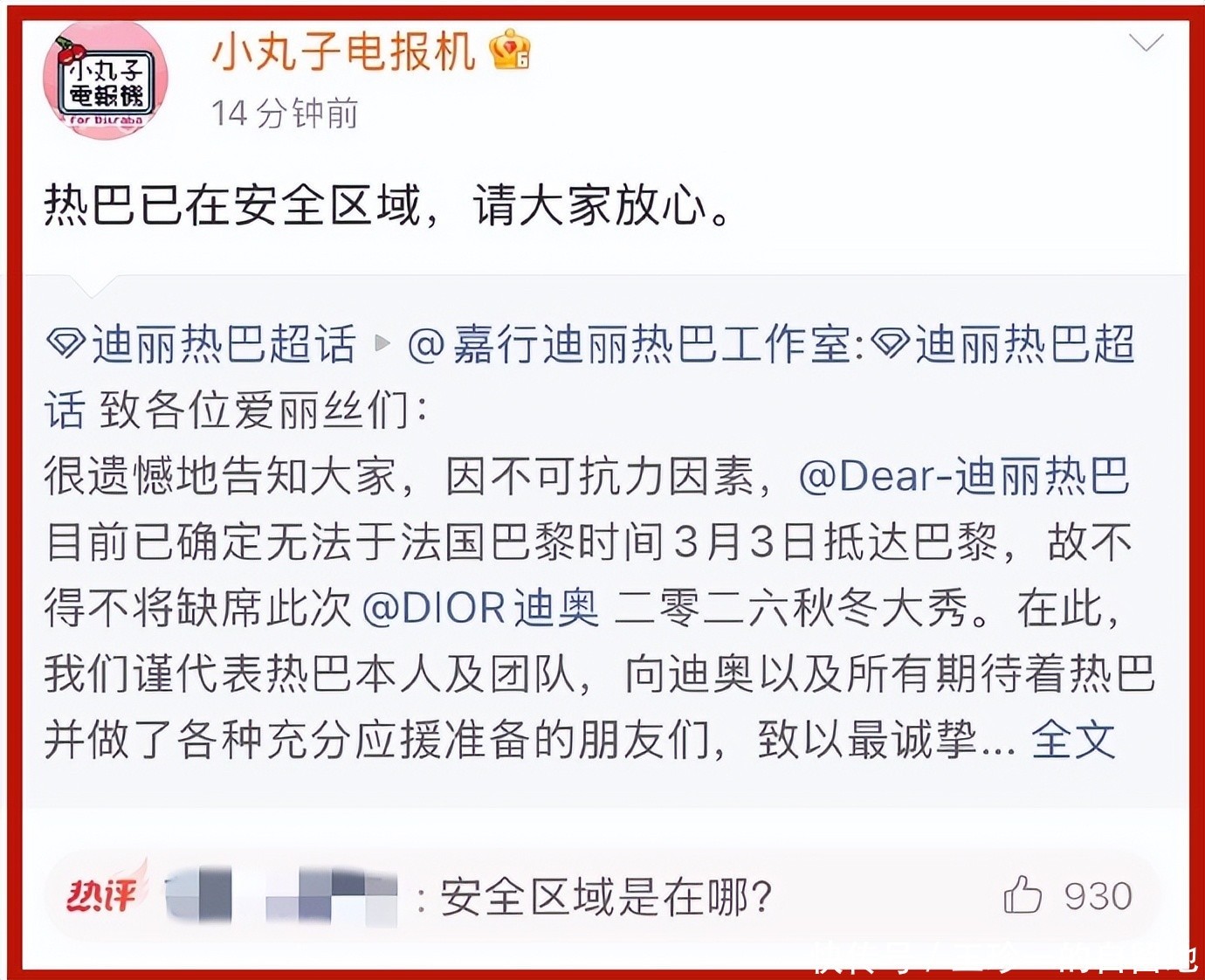 而在工作室和经纪公司发文十几分钟后,迪丽热巴的对接号也发文了,表示迪丽热巴已在安全区域,请大家放心。