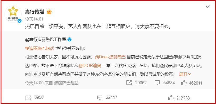 在工作室回应不久,迪丽热巴的经纪公司转发了工作室的回应,并发文:热巴目前一切平安,艺人和团队也在一起互相照应,请大家不要担心。