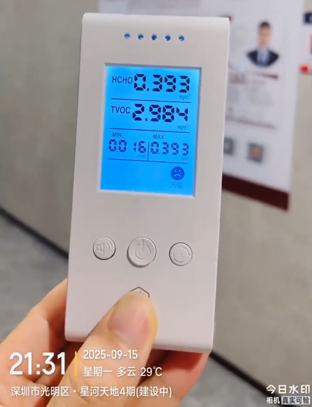 该业主指出,曾有邻居自购仪器,检测空气污染程度,“TVOC浓度加剧了业主对居住环境及身体健康的担忧。”奥一新闻记者获得的一段水印为深圳市光明区星河天地4期、2025年9月15日的视频显示,仪器检测读数为TVOC:2.98mg。